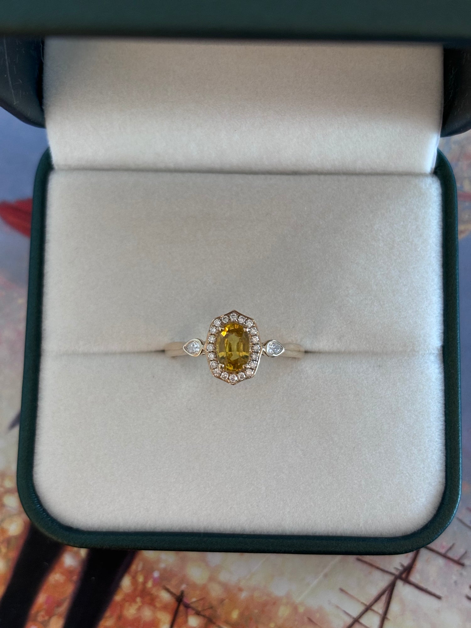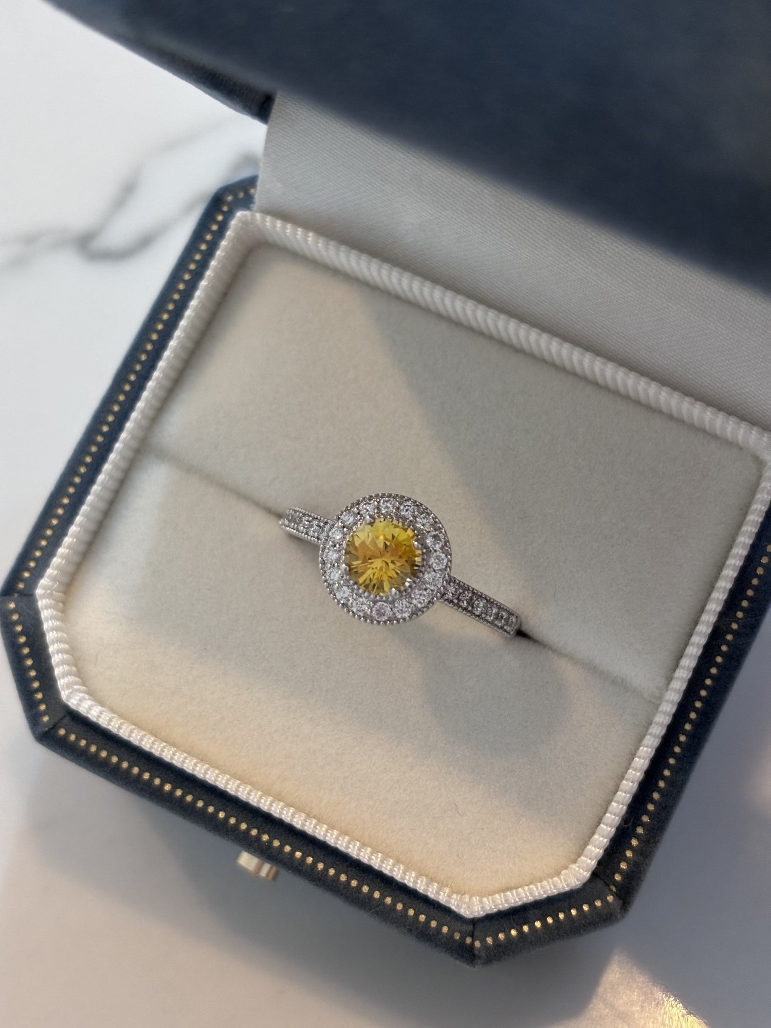 1.25ct Yellow Sapphire | 18kt white gold |Natural Diamond halo